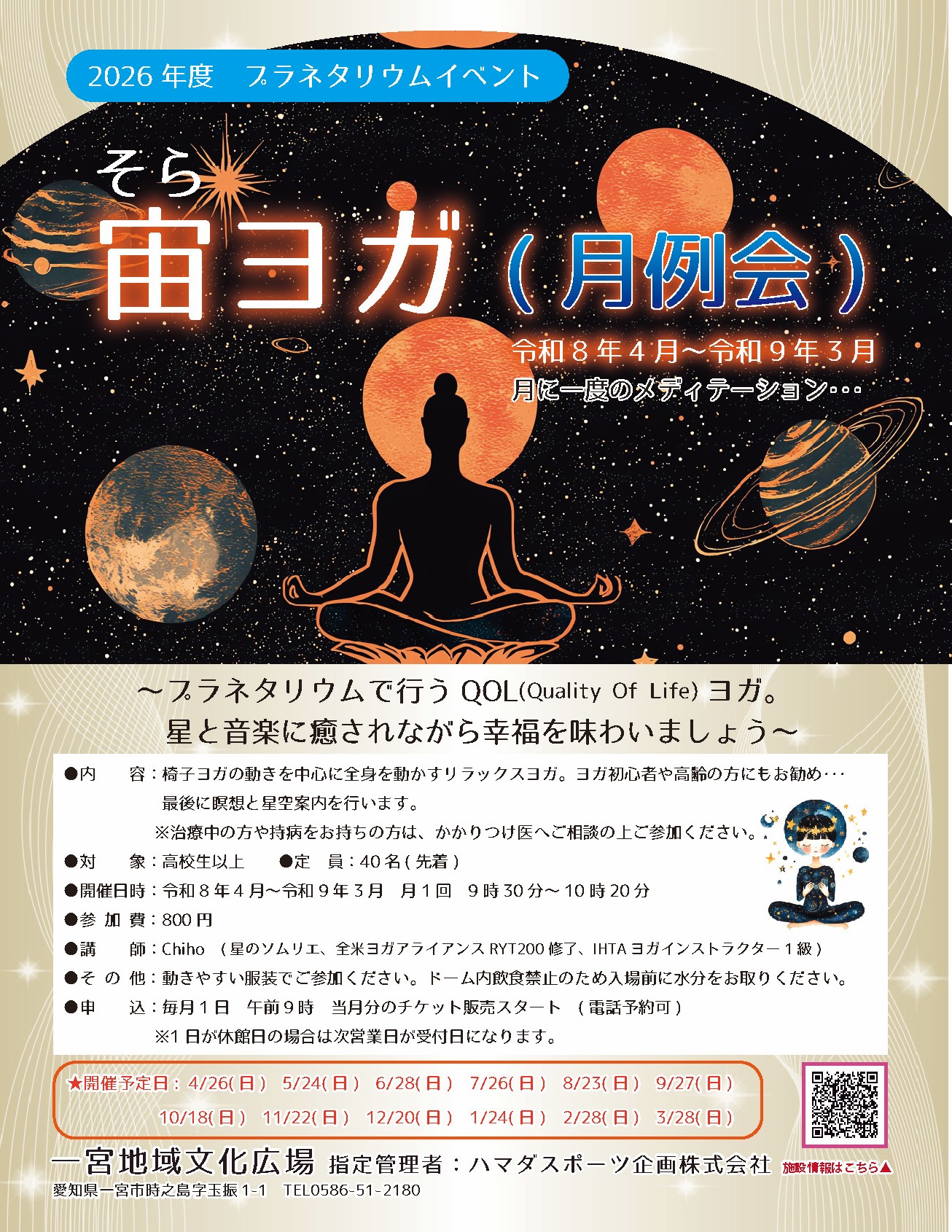 宙ヨガ(月例会)の2026年度ご案内。星空と音楽に癒されながら幸福を味わうQOL(Quality Of Life)ヨガ。椅子ヨガの動きを中心に全身をほぐし、最後に瞑想と星空案内を行います。心身ともにリラックスしたい方、運動不足を感じている方、シニアにもおすすめです。