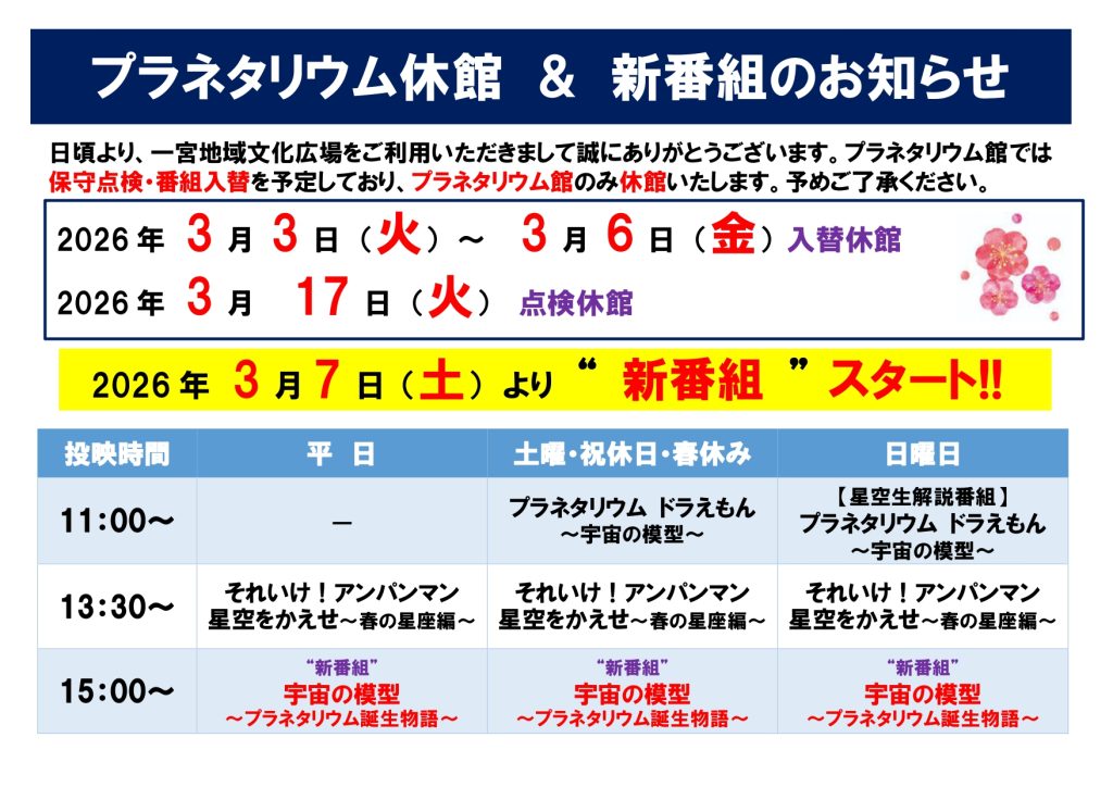 番組組替・保守点検のため、プラネタリウム館のみ休館となります。
