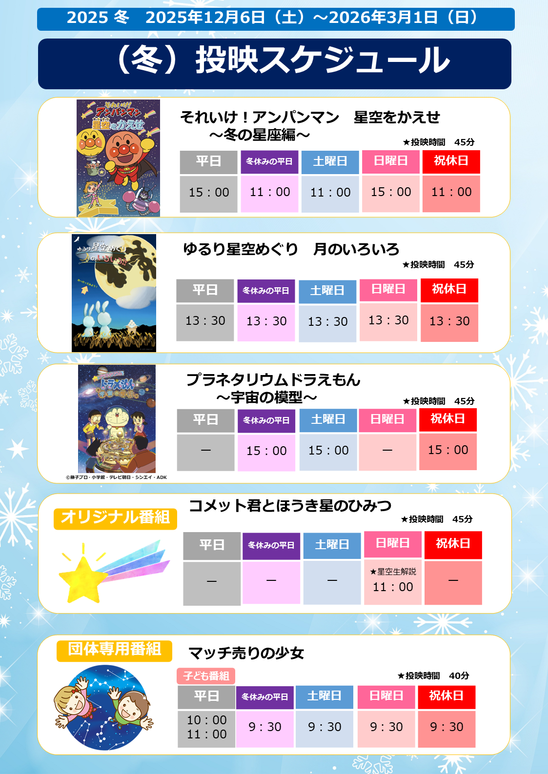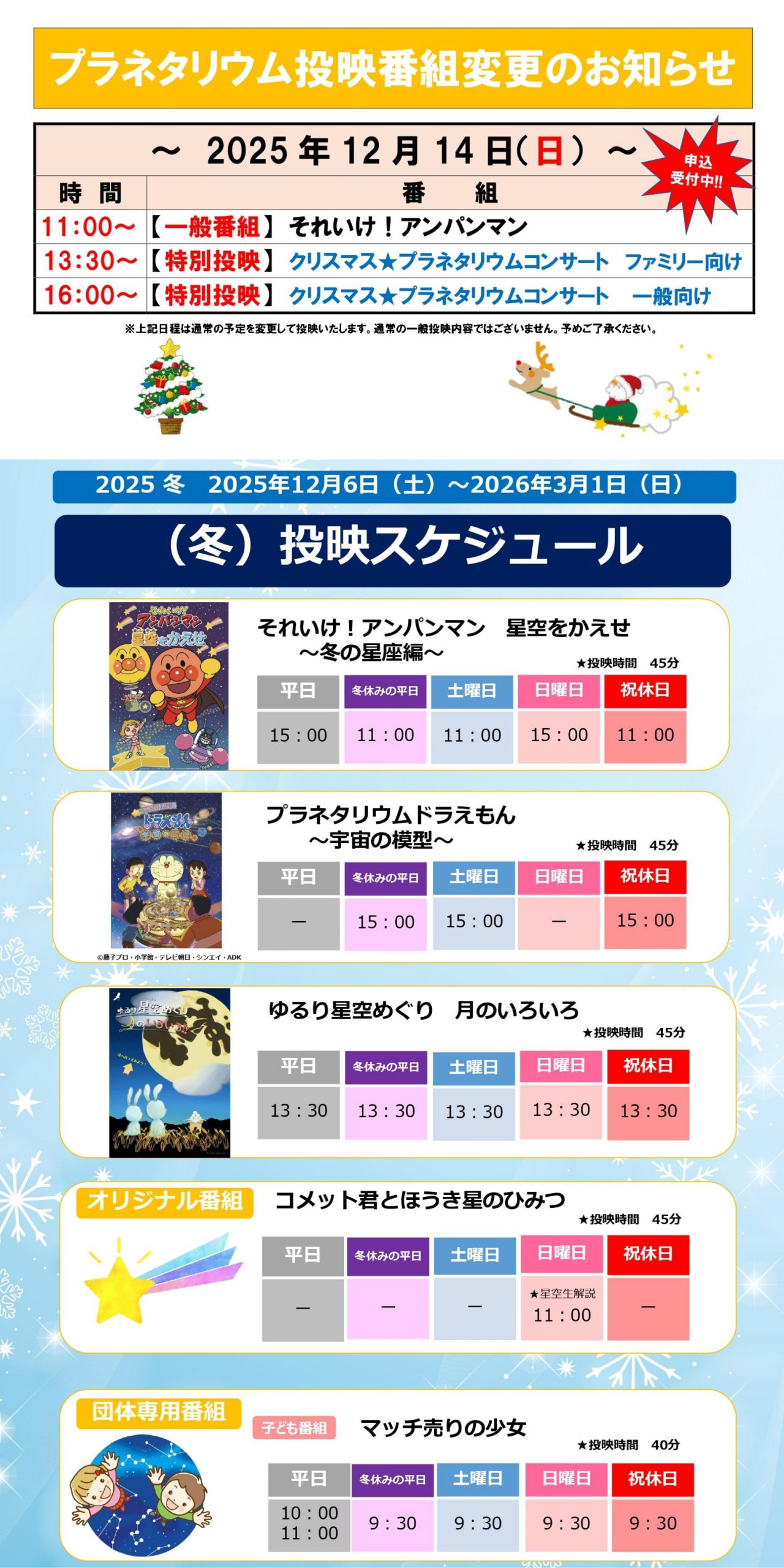 | 日曜日 | 午前11時(星空生解説と番組)、午後1時30分、午後3時 ※団体専用:午前9時30分 |