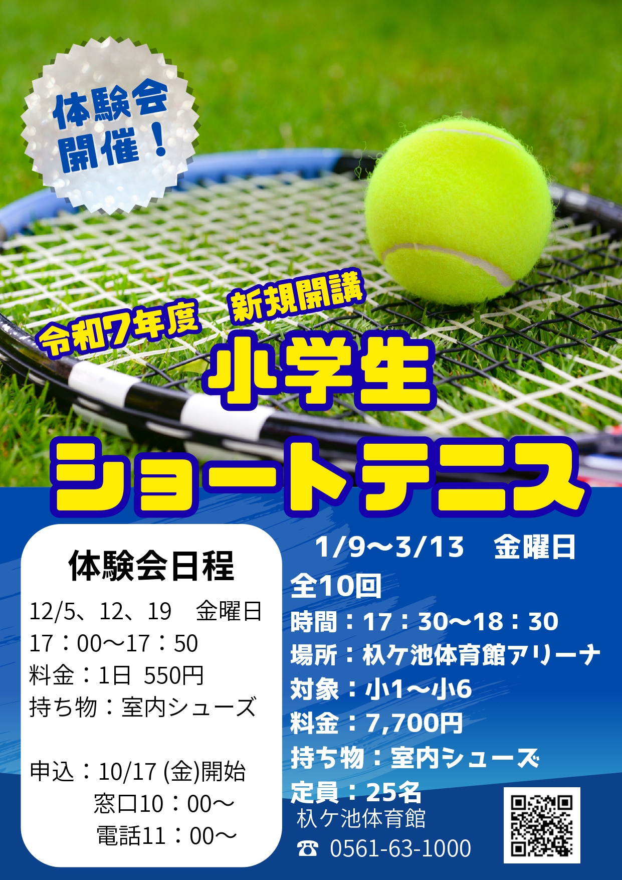 | 申込期間 | 【申込期間】 ■11月11日(火)9:00~11月24日(月・祝)21:00まで 【結果発表】 ■11月28日(金)10:00~ ※申込期間に定員を超える申込みがあった場合、抽選とさせていただきます。定員に満たない場合、申込期間終了後に随時申込受付いたします。 【申込はこちら】 https://www.hamada-sports.com/nagakute/lesson/ |