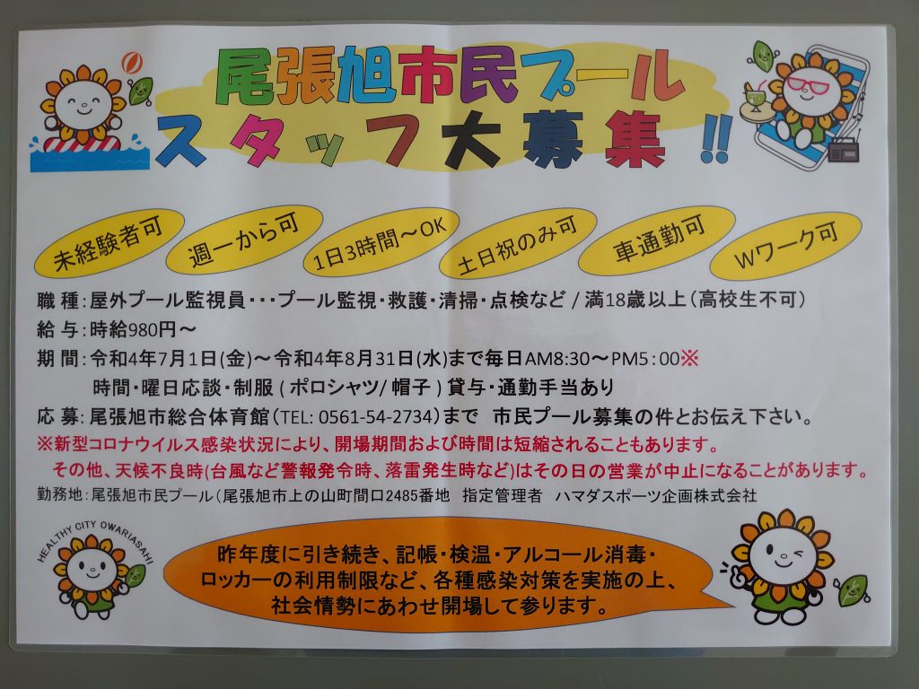 Recruitment started[募集開始] 早速ですが、今夏も市民プールスタッフを募集致します!。 燦々と降り注ぐ日光を、プールサイドにて全身で受け止めたいそこのアナタ、ご応募お待ちしております(ご質問も何なりと)。 子供好きの方には、結構うってつけの仕事だと思います。