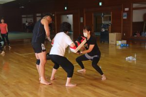 左右肘打ち30秒間。肩甲骨周りを左右に回す。