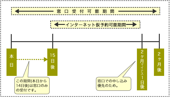 窓口受付け可能期間とパソコン・携帯電話での仮予約可能期間