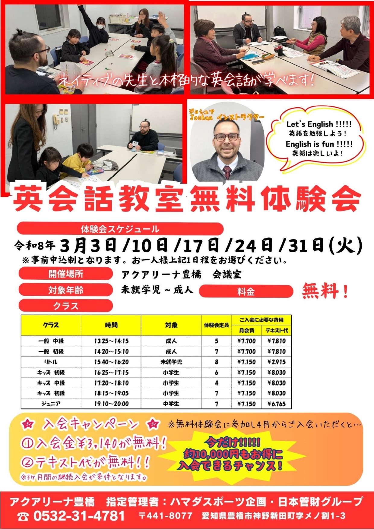 | 申込 | お申込み受付中! 【特典】 3月の体験会に参加して、4月よりご入会いただくと・・・ ➀入会金¥3,140が無料 ➁テキスト代が無料 約10,000円もお得に入会できるチャンス!!! 【お問い合わせ】 アクアリーナ豊橋(☎0532-31-4781) お電話または受付窓口にてお待ちしております! |